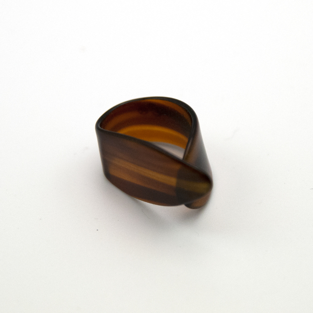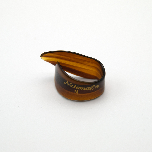 べっ甲柄ナショナル製サムピック。比較的頑丈な作りなのでハードピッキングでも大丈夫です。表面は滑らかで感触がソフトです。サムピックとして丈夫なタイプと言えるでしょう。サムピックは主にフィンガーピッキングで低音を強調するために親指にはめて使います。スペアピックとして何枚も確保しておきたいです。