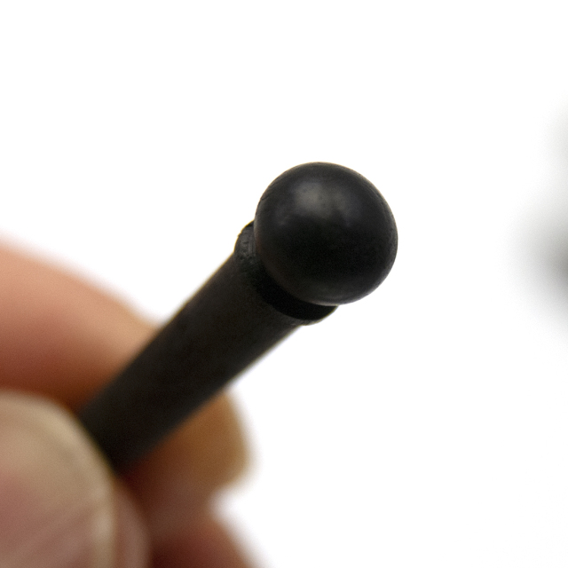 このように弦を張ると、「ボールエンド」はブリッジピンの先端には引っ掛からず、ピンの側面とブリッジの裏側に当たる部分にピッタリと固定されます。 そうすれば、弦を強く張ってもピンへかかる力が真上方向ではないため、ピンを穴に押し付ける力が働きます。摩擦力が高まるため、弦を張るほど抜けにくくなり、多少ブリッジ穴が緩くてもピンと弦がしっかり固定されます。基本的にはピンは差し込まれた力で止まっているのではなく、弦に引っ張られる事で摩擦が生まれて止まっています。 穴に対してピッタリかやや緩めのブリッジピンがベストです。ピンが太くて入らない場合は、ピンを少し削るかブリッジ穴を広げます。