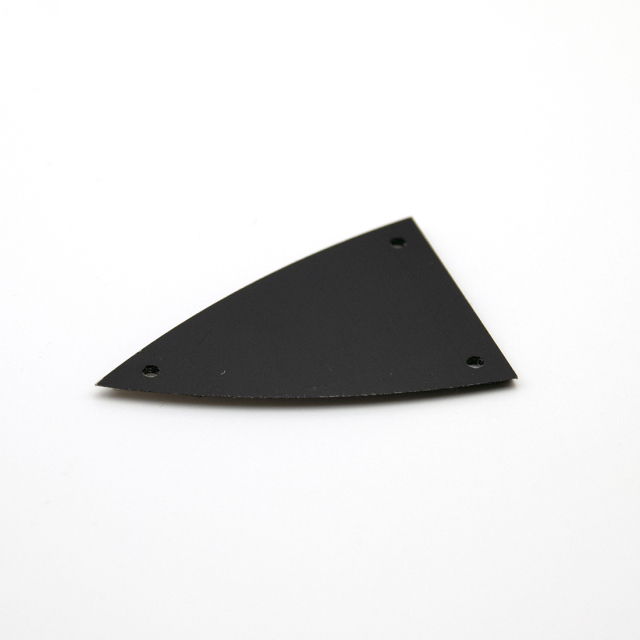 合成樹脂のロッドカバーです。黒色で3点止めです。経年変化でカバーが劣化したり、波打った状態になったら交換の時期です。これはヘッド側にロッド調整が付いているギターのカバーです。国産ギターの多くはこのサイズが使われています。ビス穴がずれている場合は、ロッドの穴位置に合わせ、ヘッド側に穴を開け直して調整します。