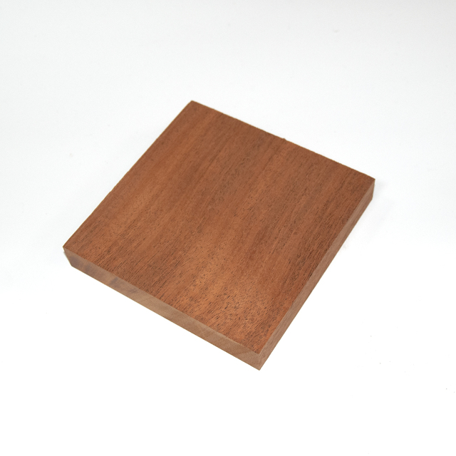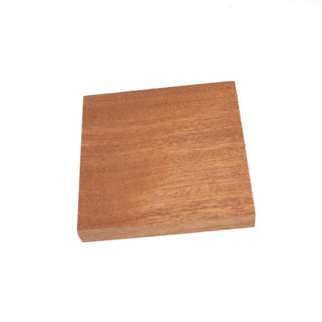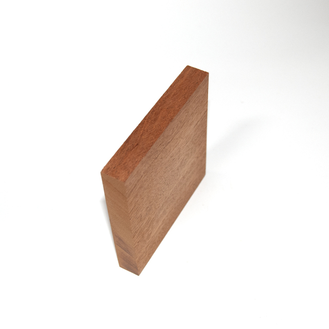 マホガニーのテイルブロックです。多くのアコースティックギターに使用されている材質です。マホガニー材は世界的な優良材で有名です。軽く加工しやすい木材でギターの多くの部位に使用されます。このブロックはギター低部に使用します。側板どうしの接ぎ合せ箇所に必要です。表板・裏板との接面は可能な限り少なくした方が表板・裏板の振動が向上すると考えられるので、その部分は必要に応じてラウンドカットし接面を減らします。