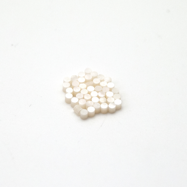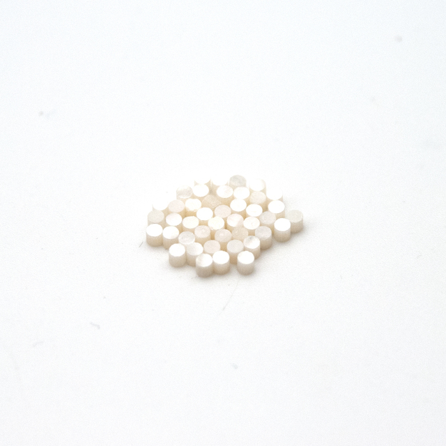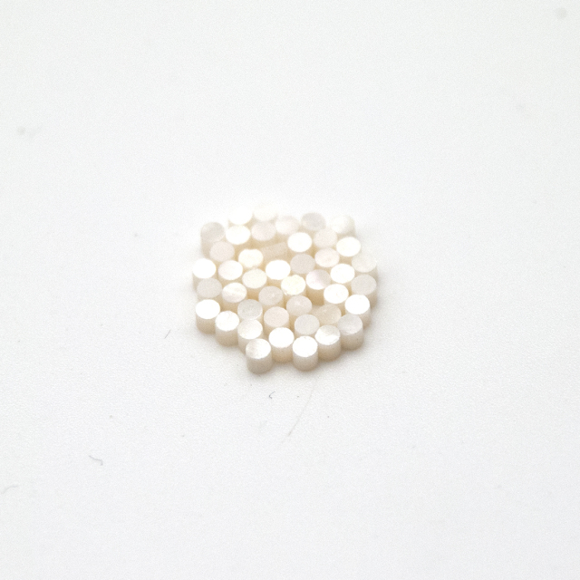 白蝶貝ドットシリーズです。ポジションマークは演奏時の目安になり、又、装飾の意味合いも含んでいます。ギター全体と自然に溶け込み、独特の雰囲気を醸し出します。サイズは2mmで一番小さいサイズです。フィンガーボードに沢山埋めても面白いでしょう。小さいドットですので、沢山埋めても全体のバランスを気にする必要はないでしょう。はでさを抑えた、さりげない装飾が好みの方に特にお奨めします。埋め込む際はドリル等でゆっくり穴を開けます。白鉛筆で中心線を描いておくと正確な位置に埋めることが出来るでしょう。