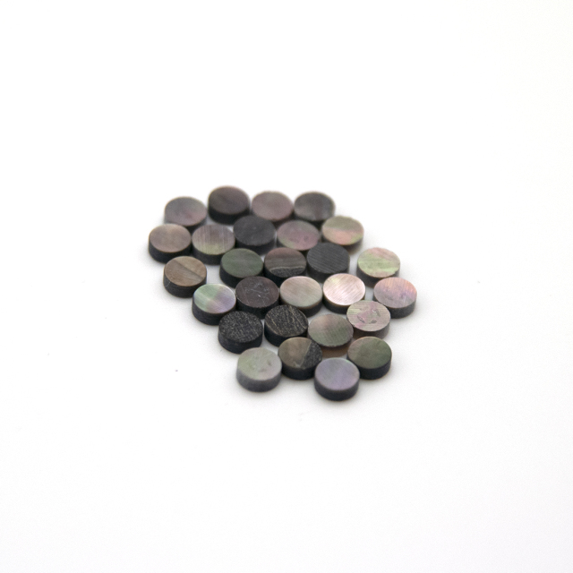 黒蝶貝ドットシリーズです。ポジションマークは演奏時の目安になり、又、装飾の意味合いも含んでいます。ギター全体と自然に溶け込み、独特の雰囲気を醸し出します。サイズは5mmで比較的大きいサイズです。フィンガーボードに埋める数は全体のバランスを考慮して控えめが良いかもしれません。他サイズのポジションマークと組み合わせても面白いでしょう。埋め込む際はドリル等でゆっくり穴を開けます。白鉛筆で中心線を描いておくと正確な位置に埋めることが出来るでしょう。