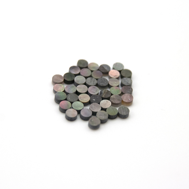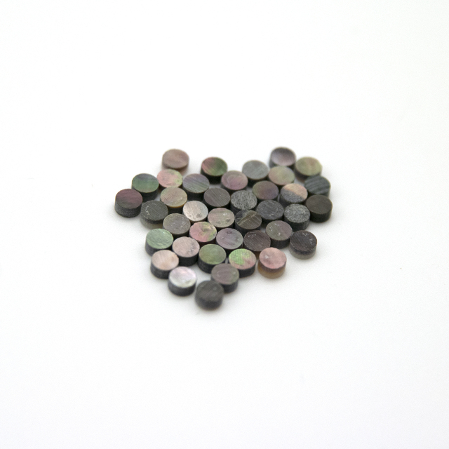 黒蝶貝ドットシリーズです。ポジションマークは演奏時の目安になり、又、装飾の意味合いも含んでいます。ギター全体と自然に溶け込み、独特の雰囲気を醸し出します。フィンガーボードに埋める数は全体のバランスを考慮して控えめが良いかもしれません。他サイズのポジションマークと組み合わせても面白いでしょう。埋め込む際はドリル等でゆっくり穴を開けます。白鉛筆で中心線を描いておくと正確な位置に埋めることが出来るでしょう。
