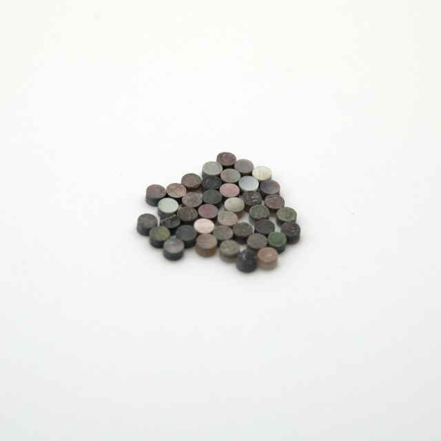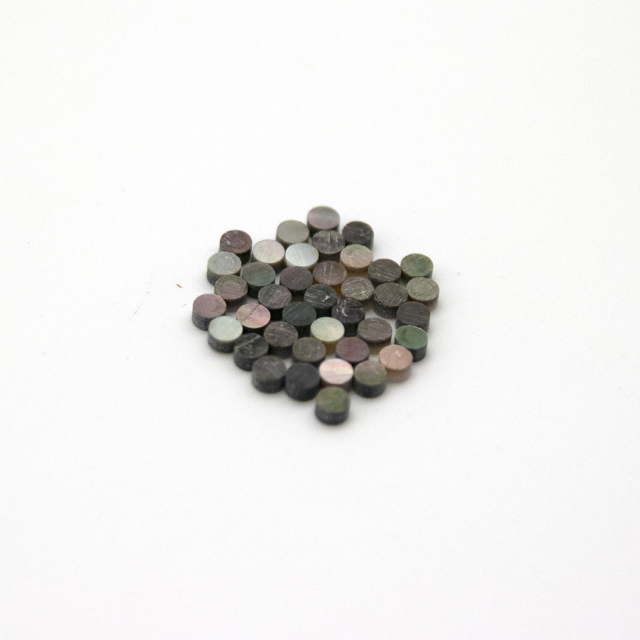 黒蝶貝ドットシリーズです。ポジションマークは演奏時の目安になり、又、装飾の意味合いも含んでいます。ギター全体と自然に溶け込み、独特の雰囲気を醸し出します。フィンガーボードに埋める数は全体のバランスを考慮して控えめが良いかもしれません。他サイズのポジションマークと組み合わせても面白いでしょう。埋め込む際はドリル等でゆっくり穴を開けます。白鉛筆で中心線を描いておくと正確な位置に埋めることが出来るでしょう。