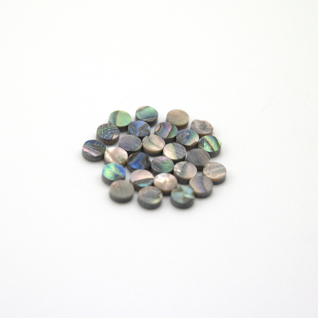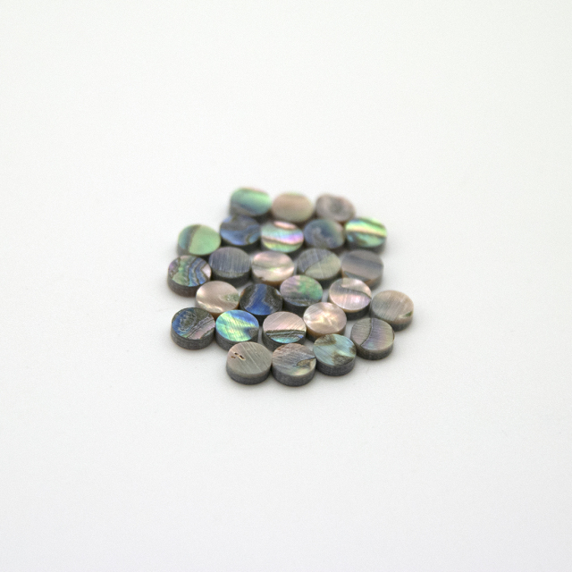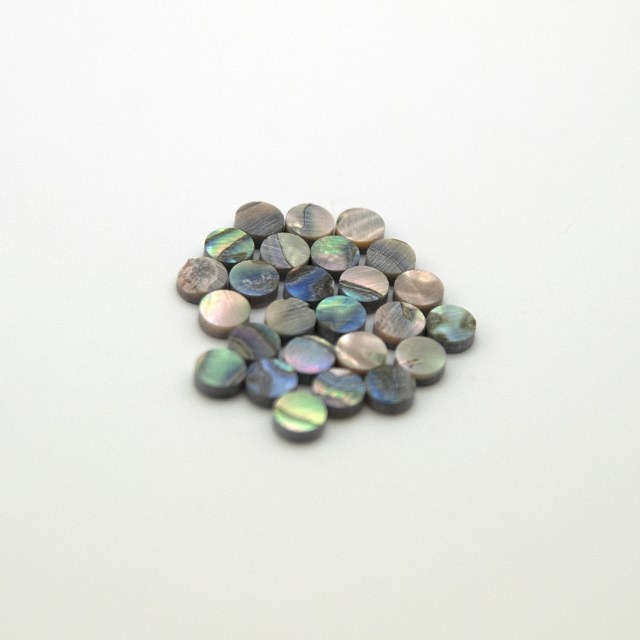 メキシコ貝ドットシリーズです。ポジションマークは演奏時の目安になり、又、装飾の意味合いも含んでいます。ギター全体と自然に溶け込み、独特の雰囲気を醸し出します。サイズは5mmで中間のサイズです。フィンガーボードに沢山埋めても面白いでしょう。ただし全体のバランスを少し考えましょう。メキシコ貝独特の神秘的で力強い装飾が好みの方にお奨めします。埋め込む際はドリル等でゆっくり穴を開けます。白鉛筆で中心線を描いておくと正確な位置に埋めることが出来るでしょう。