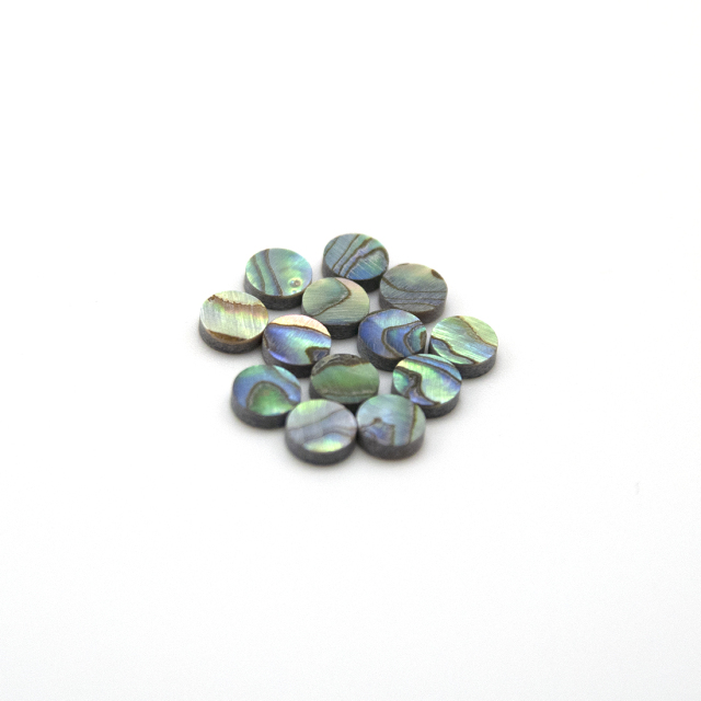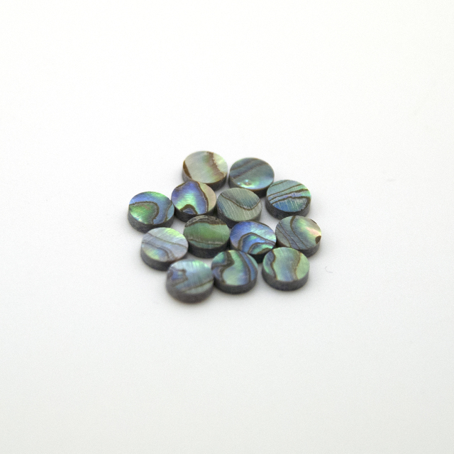 メキシコ貝ドットシリーズです。ポジションマークは演奏時の目安になり、又、装飾の意味合いも含んでいます。ギター全体と自然に溶け込み、独特の雰囲気を醸し出します。サイズは6mmで大き目サイズです。フィンガーボードに沢山埋めても面白いでしょう。ただし全体のバランスを少し考えましょう。メキシコ貝独特の神秘的で力強い装飾が好みの方にお奨めします。埋め込む際はドリル等でゆっくり穴を開けます。白鉛筆で中心線を描いておくと正確な位置に埋めることが出来るでしょう。