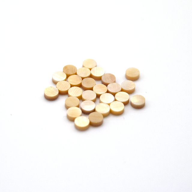 黄蝶貝ドットシリーズです。写真は各種サイズまとめて写っていますが、このページでのご注文は「直径5mmのポジションマークのみ」です。ご注文は12個セットです。個数欄「1」で12個の5mmポジションマークをお届けします。ポジションマークは演奏時の目安になり、又、装飾の意味合いも含んでいます。ギター全体と自然に溶け込み、独特の雰囲気を醸し出します。フィンガーボードに埋める数は全体のバランスを考慮して控えめが良いかもしれません。他サイズのポジションマークと組み合わせても面白いでしょう。埋め込む際はドリル等でゆっくり穴を開けます。白鉛筆で中心線を描いておくと正確な位置に埋めることが出来るでしょう。