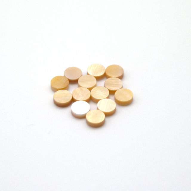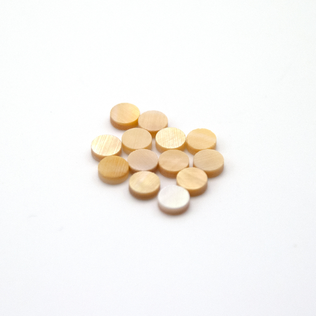 黄蝶貝ドットシリーズです。写真は各種サイズまとめて写っていますが、このページでのご注文は「直径6mmのポジションマークのみ」です。ご注文は12個セットです。個数欄「1」で12個の6mmポジションマークをお届けします。ポジションマークは演奏時の目安になり、又、装飾の意味合いも含んでいます。ギター全体と自然に溶け込み、独特の雰囲気を醸し出します。フィンガーボードに埋める数は全体のバランスを考慮して控えめが良いかもしれません。他サイズのポジションマークと組み合わせても面白いでしょう。埋め込む際はドリル等でゆっくり穴を開けます。白鉛筆で中心線を描いておくと正確な位置に埋めることが出来るでしょう。