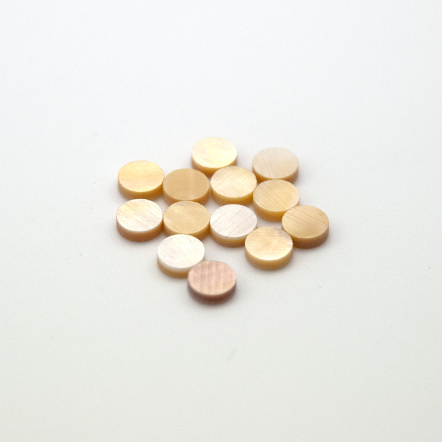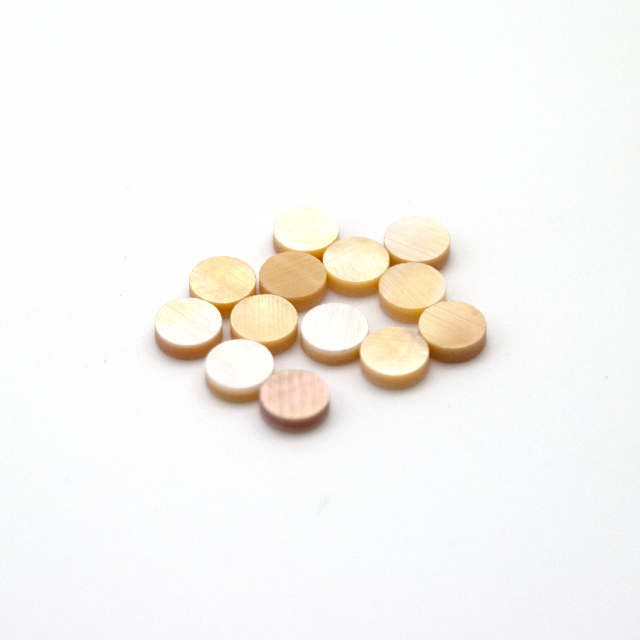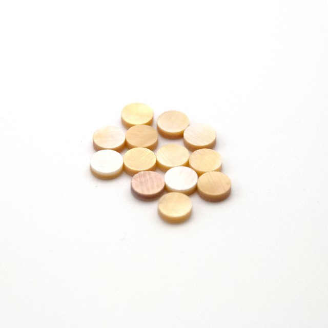 黄蝶貝ドットシリーズです。写真は各種サイズまとめて写っていますが、このページでのご注文は「直径6.5mmのポジションマークのみ」です。ご注文は12個セットです。個数欄「1」で12個の6.5mmポジションマークをお届けします。ポジションマークは演奏時の目安になり、又、装飾の意味合いも含んでいます。ギター全体と自然に溶け込み、独特の雰囲気を醸し出します。フィンガーボードに埋める数は全体のバランスを考慮して控えめが良いかもしれません。他サイズのポジションマークと組み合わせても面白いでしょう。埋め込む際はドリル等でゆっくり穴を開けます。白鉛筆で中心線を描いておくと正確な位置に埋めることが出来るでしょう。