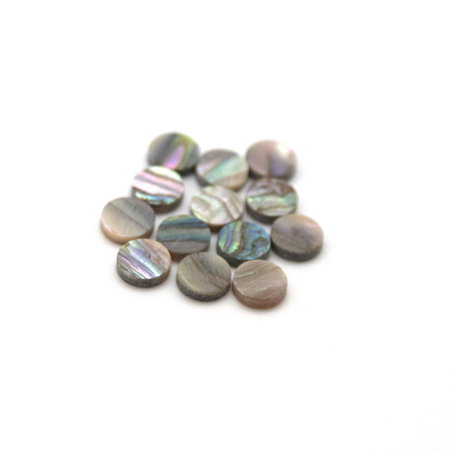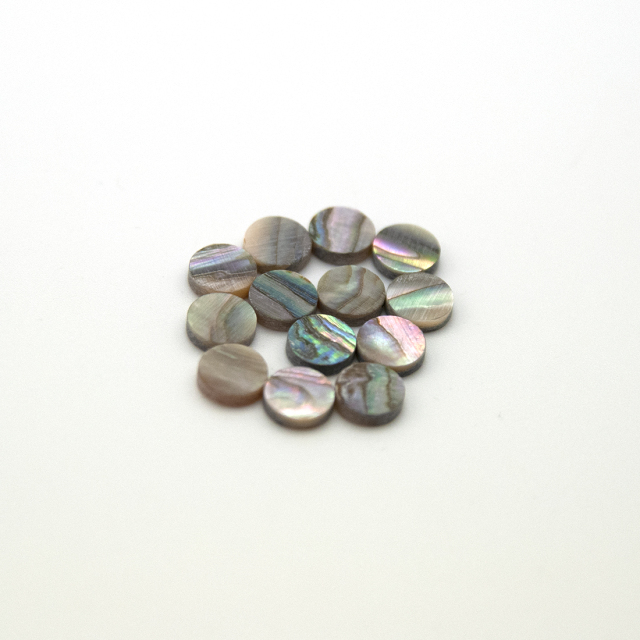 直径7.0mmのメキシコ貝ドットです。ポジションマークは演奏時の目安になり、又、装飾の意味合いも含んでいます。ギター全体と自然に溶け込み、独特の雰囲気を醸し出します。サイズは7.0mmで大きいサイズです。フィンガーボードに埋める数は全体のバランスを考慮して控えめが良いかもしれません。他サイズのポジションマークと組み合わせても面白いでしょう。埋め込む際はドリル等でゆっくり穴を開けます。白鉛筆で中心線を描いておくと正確な位置に埋めることが出来るでしょう。