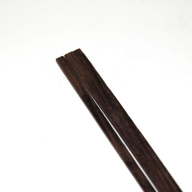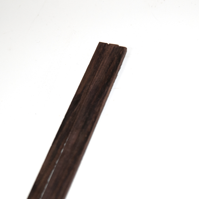 「バインディング」はギター本体の外周を覆うもので、材質はローズウッド材です。木材の色としては茶系の少し濃いめで、落ち着いた雰囲気が出ます。「幅5mm」とは、ボディーのサイドから見た場合の高さにあたります。また「厚み2mm」とはボディーを前面から見た場合の太さにあたります。「長さ850mm」については、片巻きできるだけの長さです。1台のギターには2本のバインディングが必要です。熱を加えながらボディのシェイプに曲げてゆきます。パーフリングとバインディングは素材を合わせると自然なまとまりになります。