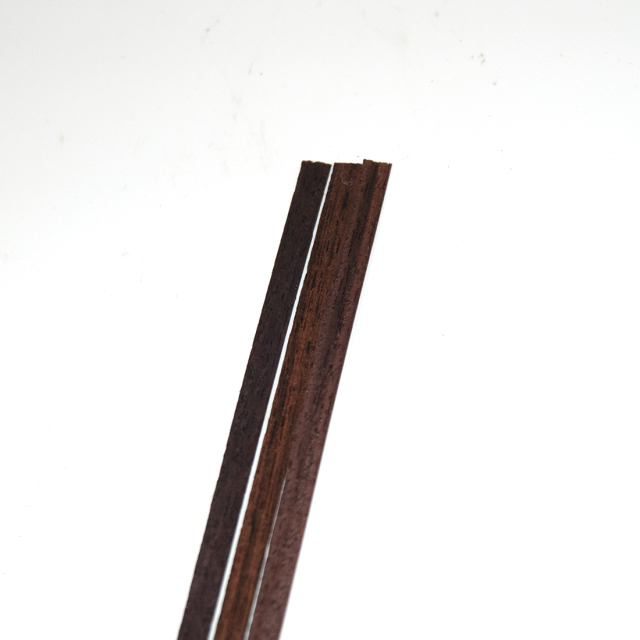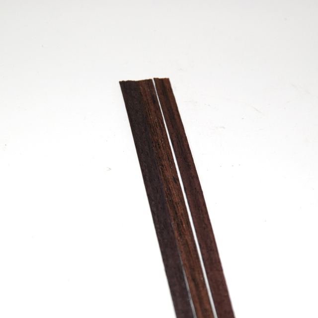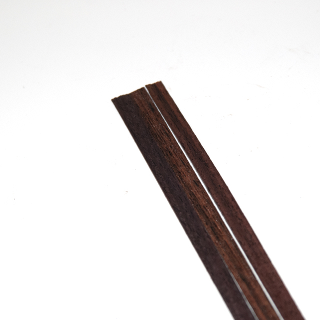 薄めのローズウッドバインディングです。メインのバインディングに変化を付けるのに役立ちます。他のバインディングと組み合わせて使用します。「バインディング」はギター本体の外周を覆うもので、材質はローズウッド材です。木材の色としては茶系の少し濃いめで、落ち着いた雰囲気が出ます。「幅6mm」とは、ボディーのサイドから見た場合の高さにあたります。また「厚み0.5mm」とはボディーを前面から見た場合の太さにあたります。「長さ850mm」については、片巻きできるだけの長さです。1台のギターには2本のバインディングが必要です。熱を加えながらボディのシェイプに曲げてゆきます。パーフリングとバインディングは素材を合わせると自然なまとまりになります。