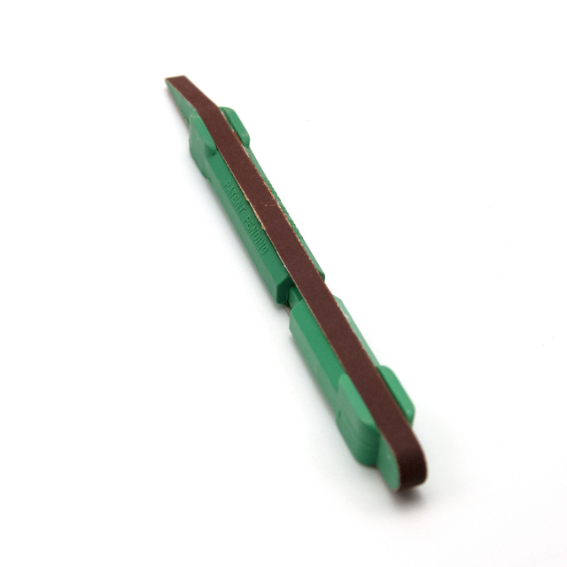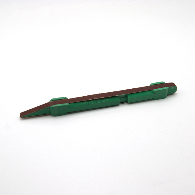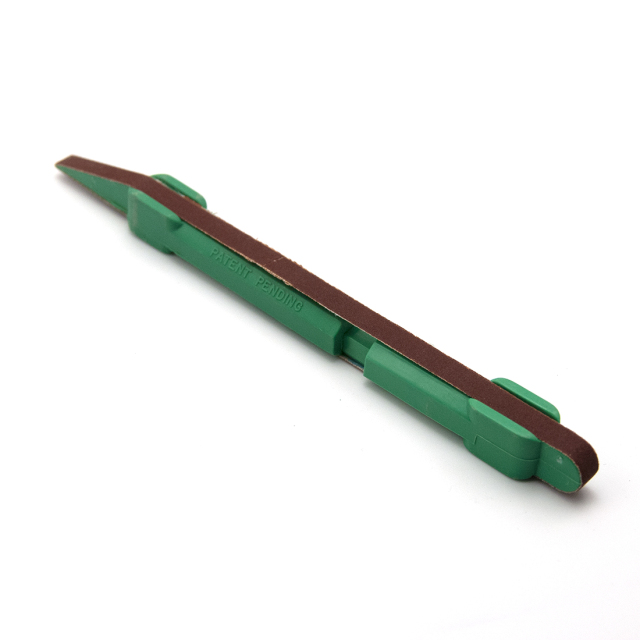 #320番手のペンシルサンダー。フレットの角を仕上げる時に便利です。先がとがっていますので、フレットワイアーの角のように小さな部分のヤスリがけに適しています。 ベルトは本体を押して長さを短かくしてから交換します。