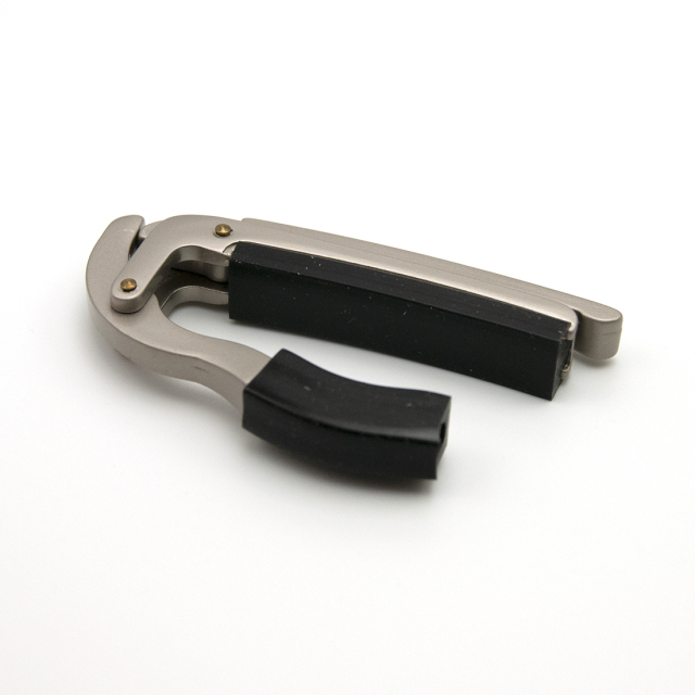 ゴム式のゴムバンドの代わりにベルトを使ったカポ。てこの原理を使ってベルトを固定 するので、演奏中にかぽの着脱をするのは慣れが必要。