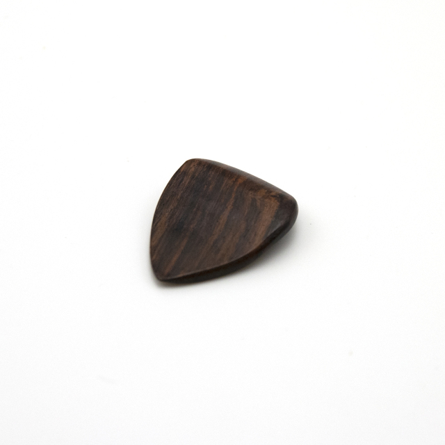 カーブ状で厚めなフラットピックです。材質はレアなローズウッドが使われています。甘くメローな音色が特徴です。適度な大きさで手になじみます。天然素材を1つ1つ職人の手で仕上げられています。その関係で色や柄はどれ1つとして同じものはありません。ピックを持った時のグリップ感をサポートする「くぼみ」がポイント。ピックの素材による音の違いを楽しんでみてはいかがでしょう ?