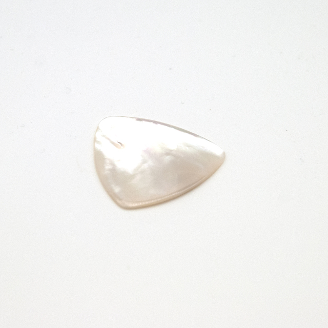MOP ( 白蝶貝 ) はギター指板のポジションマークやヘッドマークなどに使われており、真珠のような輝きを放つとても美しい貝です。 この貝を三角形ピックの形状に切削し、周囲を両サイドから斜めに加工し、先端に向かって薄く丸みを持たせ、美しく磨き上げてあります。 実用的なピックの美術工芸品です。両表面には滑り止め Gel Grip を添付し弾き易くしてあります。ご使用の際は、表面のフィルムを取り除いてご使用ください。