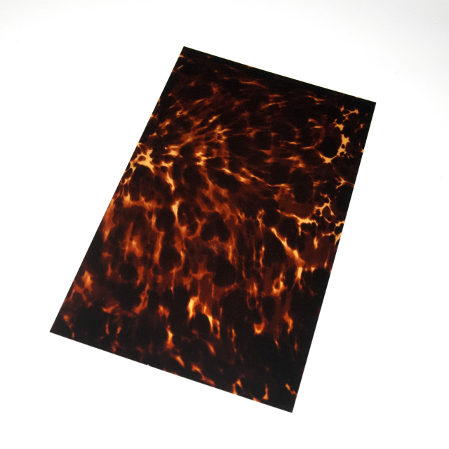 明るいオレンジ系の下地に茶系の柄が動きのある感じに表現されている柄です。ギターのアクセント柄としては最高の部類に入ると言っても過言ではないでしょう。比較的高級なギター向きといえます。サイズは220mm x 290mm でドレッドノートやジャンボタイプには2枚のピックガードが取れます。スモールタイプやパーラータイプには3枚のピックガードが可能です。裏に接着剤が付いていますので、シートをはがして簡単に取り付けられます。