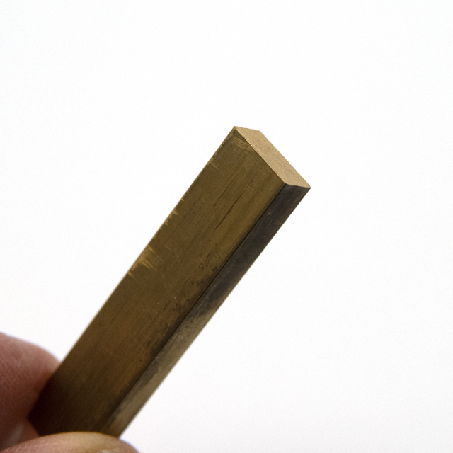 ナット幅をラフカットしたら、次にカーブ加工を行います。まずヘッド側部分のラウンドを大まかに描きます。(画像の傾斜部分) 一般的にラウンドが緩やかですと太くて強い音、傾斜がきついとシャープで繊細な音に近づきますので、好みでラウンド具合を決めます。ナットのラウンド加工も「万力」に固定し「平ヤスリ」で行います。この「平ヤスリ」はフレットのすり合わせにも使用できる便利なヤスリです。基本ツールとして確保されることをおすすめします。