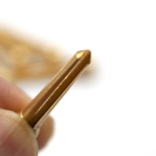 ブラス(真鍮=銅と亜鉛の合金)で作られた汎用ブリッジピンです。形状が頭の部分から底に向かって細くなってゆき「ピン足の傾斜 (テーパー)」 が強めのブリッジピンです。ピンの足先は細めです。ブラスで出来ていますので、音質は堅めでクールになります。現状の音が柔らか過ぎて物足りない方は、このブラス製ブリッジピンに交換するとシャープさが増すでしょう。又、シャリ感のある音にしたい方にもオススメです。木製や骨製などでは出せない個性的なサウンドが期待出来ます。