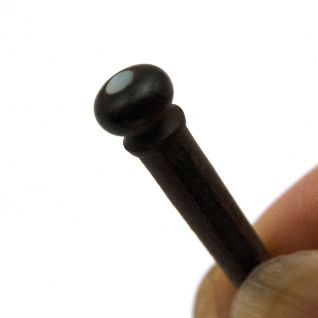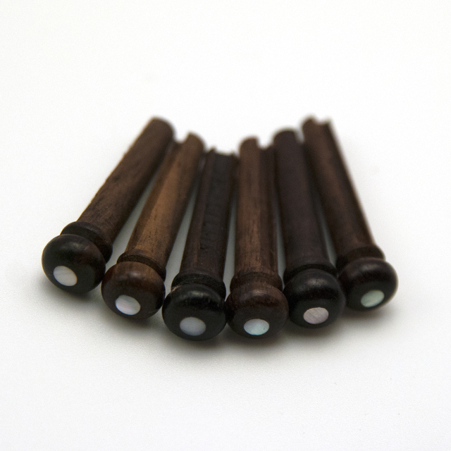 ローズウッド材で白蝶貝ドットの汎用ブリッジピンです。 ナチュラルで比較的甘いトーンが得られます。弦用の溝が彫ってありますので、弦とのマッチングも良好です。ブリッジピンには樹脂系素材もありますが、グレードアップには木材や骨材をおすすめします。材質的には中級以上のギターに使用されています。シャリ感を少し抑えたい場合も適します。インディングが同系色やウッドならば相性は良いでしょう。又、ブリッジピンは弦の振動を直接受ける重要な役割を持っているパーツですので、素材にはこだわりましょう。