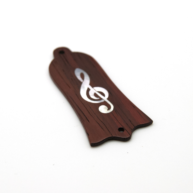 ト音記号のインレイを白蝶貝で入れた、手作りロッドカバーです。材質はパドゥクです。ヘッドにアクセントを付けたい場合に向いた素材です。ヘッド部分に取付けるタイプで、ビス穴の間隔は約52mmです。交換の際、穴間隔が多少違っていても問題はありません。 尚、天然素材のため柄や色合いが写真と異なることがありますので、ご了承ください。