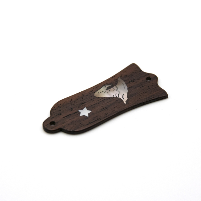 帽子のインレイを白蝶貝で入れた、手作りロッドカバーです。材質はインドローズです。ヘッドにアクセントを付けたい場合に向いた素材です。ヘッド部分に取付けるタイプで、ビス穴の間隔は約52mmです。交換の際、穴間隔が多少違っていても問題はありません。 尚、天然素材のため柄や色合いが写真と異なることがありますので、ご了承ください。