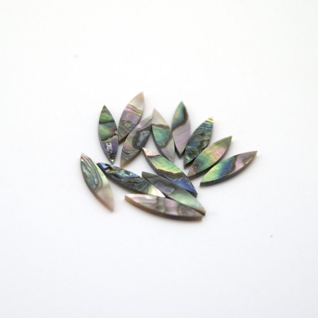 キャッツアイ型のメキシコ貝です。有名なところではビンテージオールドのマーチンギターに埋められています。ビンテージオールド風に渋く仕上げたい方に最適です。ポジションマークは演奏時の目安になり、又、装飾の意味合いも含んでいます。ギター全体と自然に溶け込み、独特の雰囲気を醸し出します。フィンガーボードにポイントとして埋めるのが良いでしょう。大中のキャッツアイやダイアモンド形と組合せても面白いでしょう。沢山埋めても全体のバランスをさほど気にする必要はないでしょう。はでさを抑えた、渋い装飾が好みの方に特にお奨めします。埋め込む際はドリル等でゆっくり穴を開け、ナイフ等で調整します。白鉛筆で中心線を描いておくと正確な位置に埋めることが出来るでしょう。すき間にはフィンガーボードと同じ木材の粉を埋めると良いでしょう。