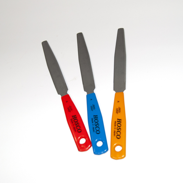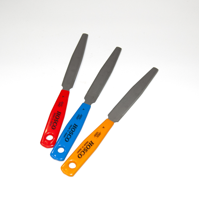 以上に注意しながらお好みのサウンドに近づけるよう調整しましょう。弦溝を掘る際には専用ヤスリが便利です。弦の太さに応じて使い分け出来るので安心の専用ヤスリです。ナットの成形が終了したら、ナットを接着剤なしで仮セットし、弦を張り状態を確認します。弦を張った時点で不具合があれば再調整します。調整が全て完了したらナット底面・横面に3滴づつ程度「瞬間接着剤」を付けて固定します。